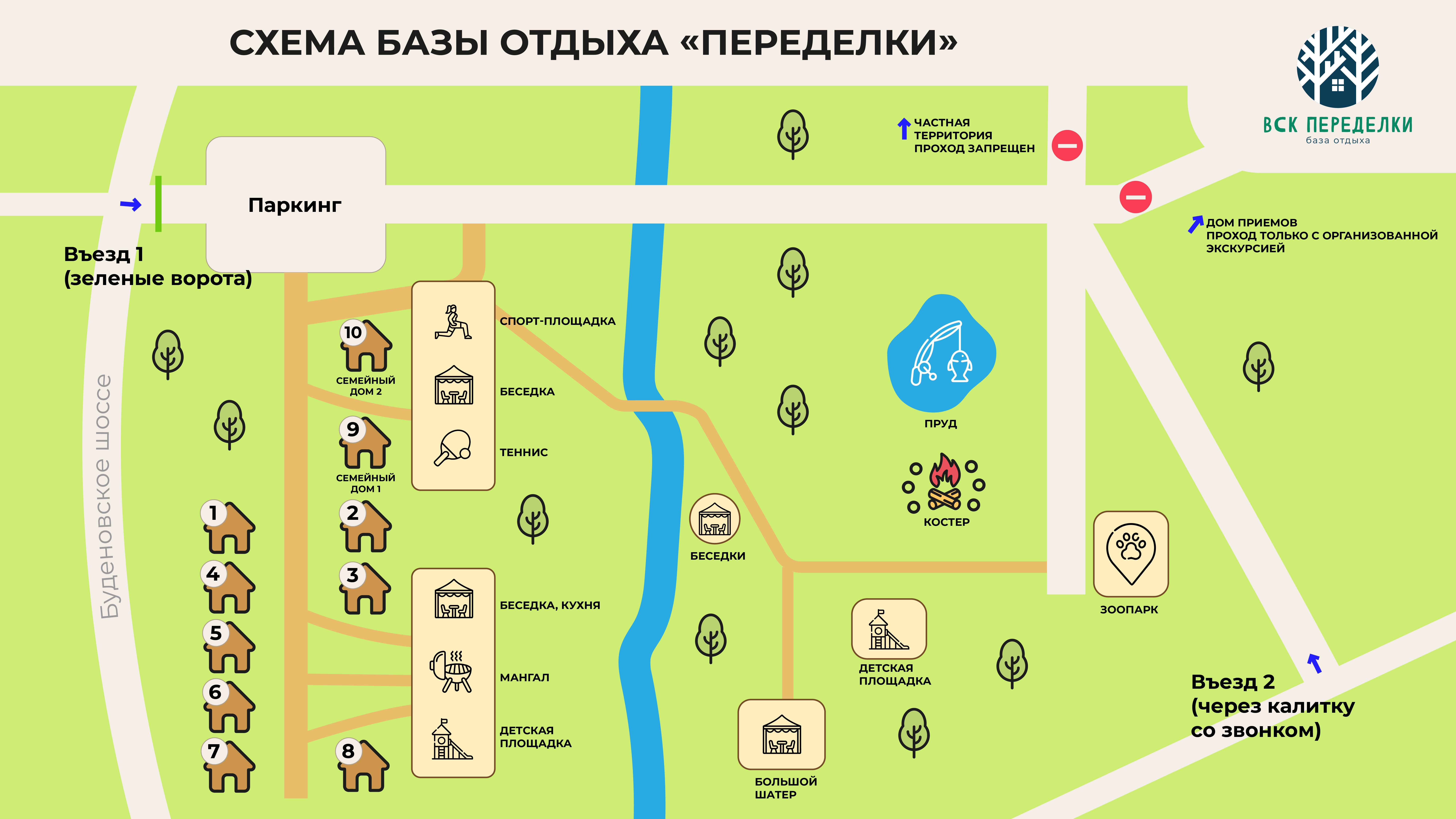 Выезд под кирпич разрешен. На КПП сказать, что в Туристический Центр ВСК. Для заезда на территорию необходимо позвонить охране или использовать звонок на воротах. Важно! На такси можно доехать до ворот ТурЦентра, дальше пешком по территории (держаться все время левее).